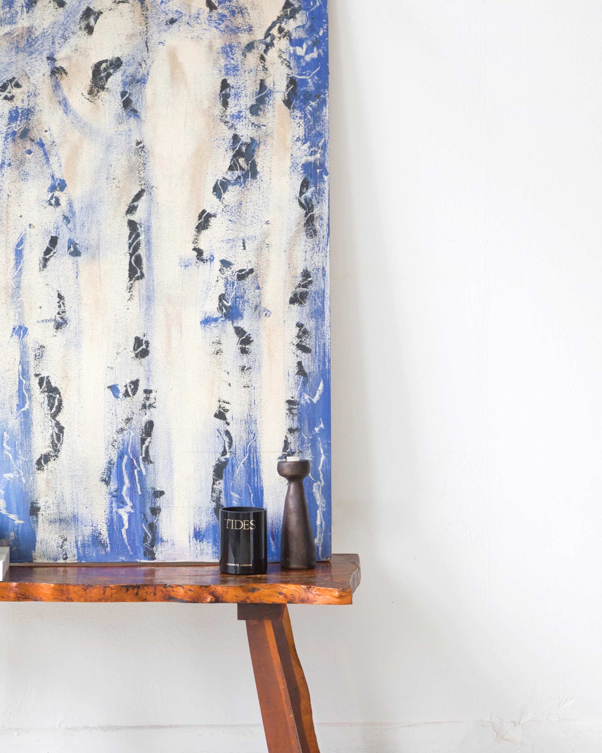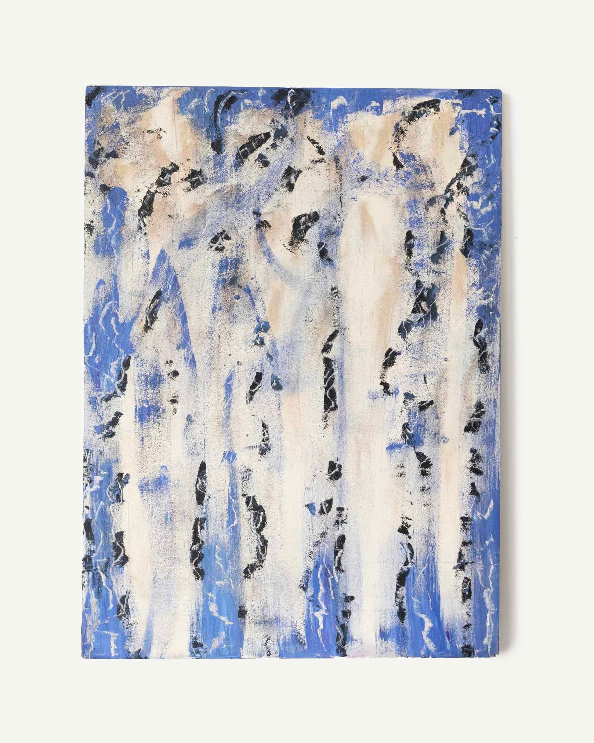 A dynamic abstract oil painting on board, blending blue, black, and nude hues with sand for organic texture. Bold brushstrokes create a striking tribute to color, texture, and pattern.