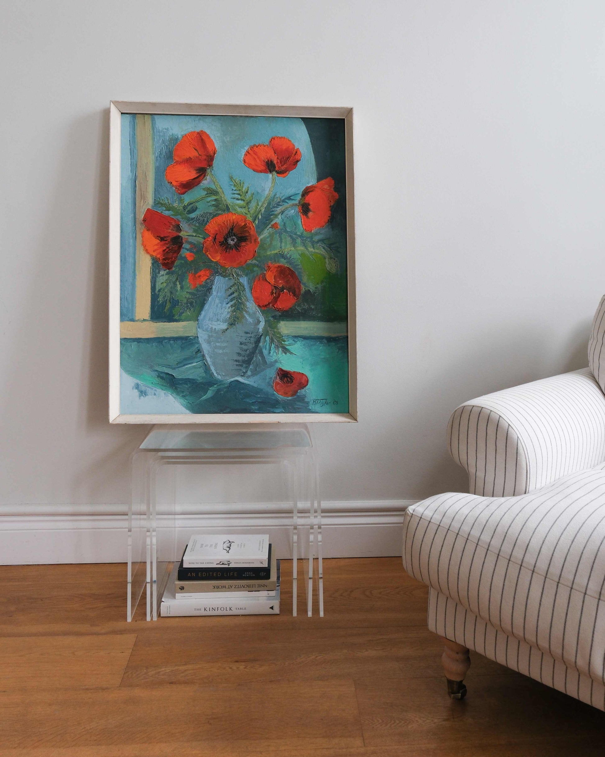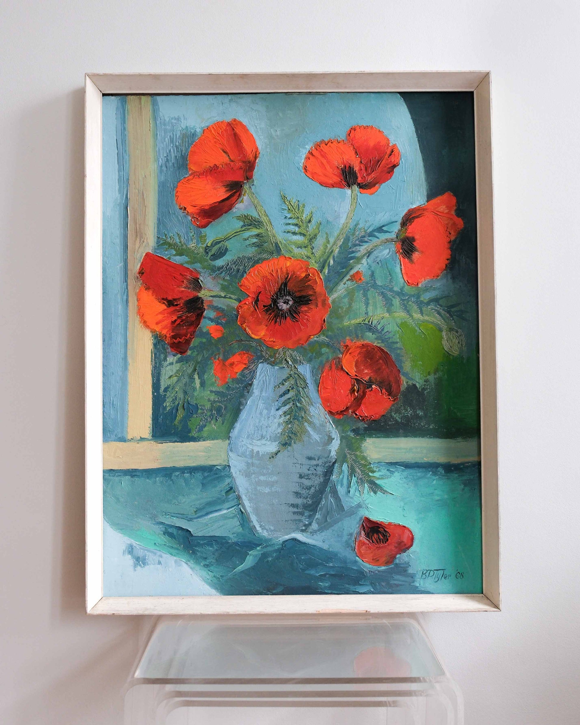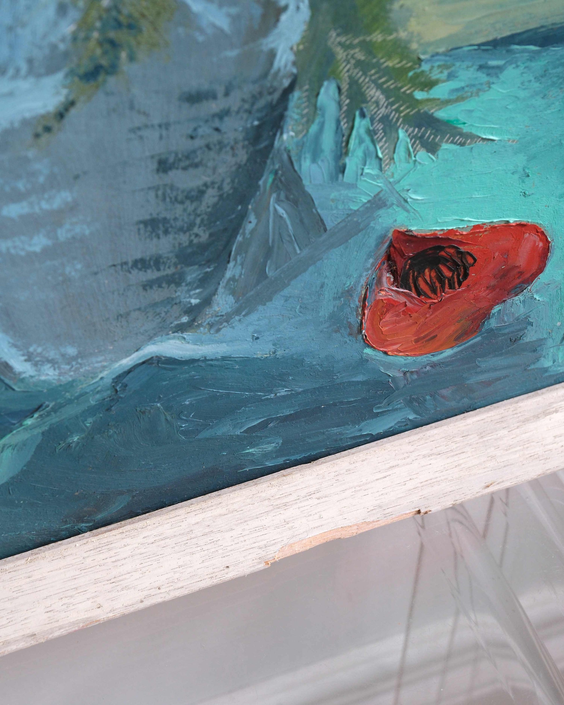 Oil painting on board, blending bright reds, blue, and green hues. Bold brushstrokes create a striking tribute to colour, texture, and pattern.