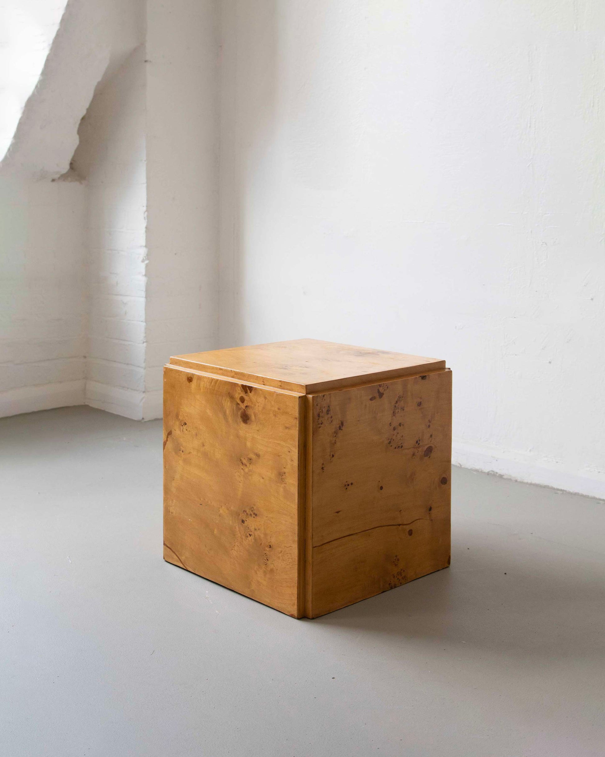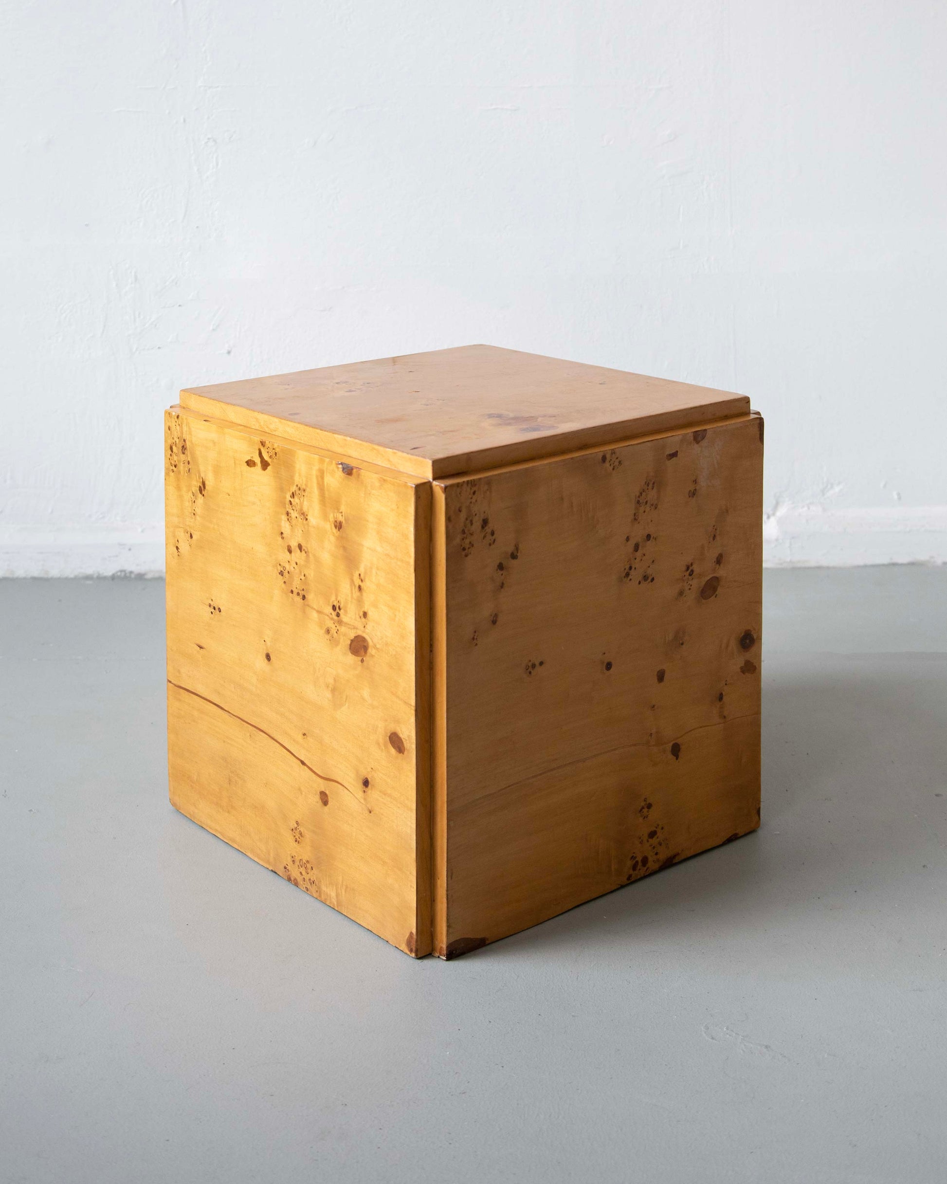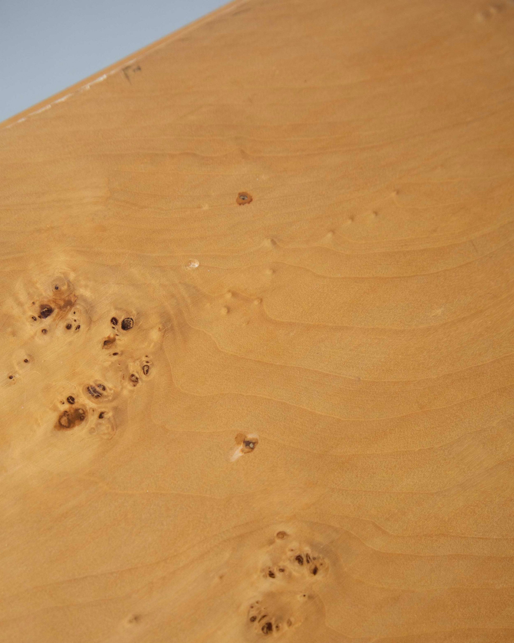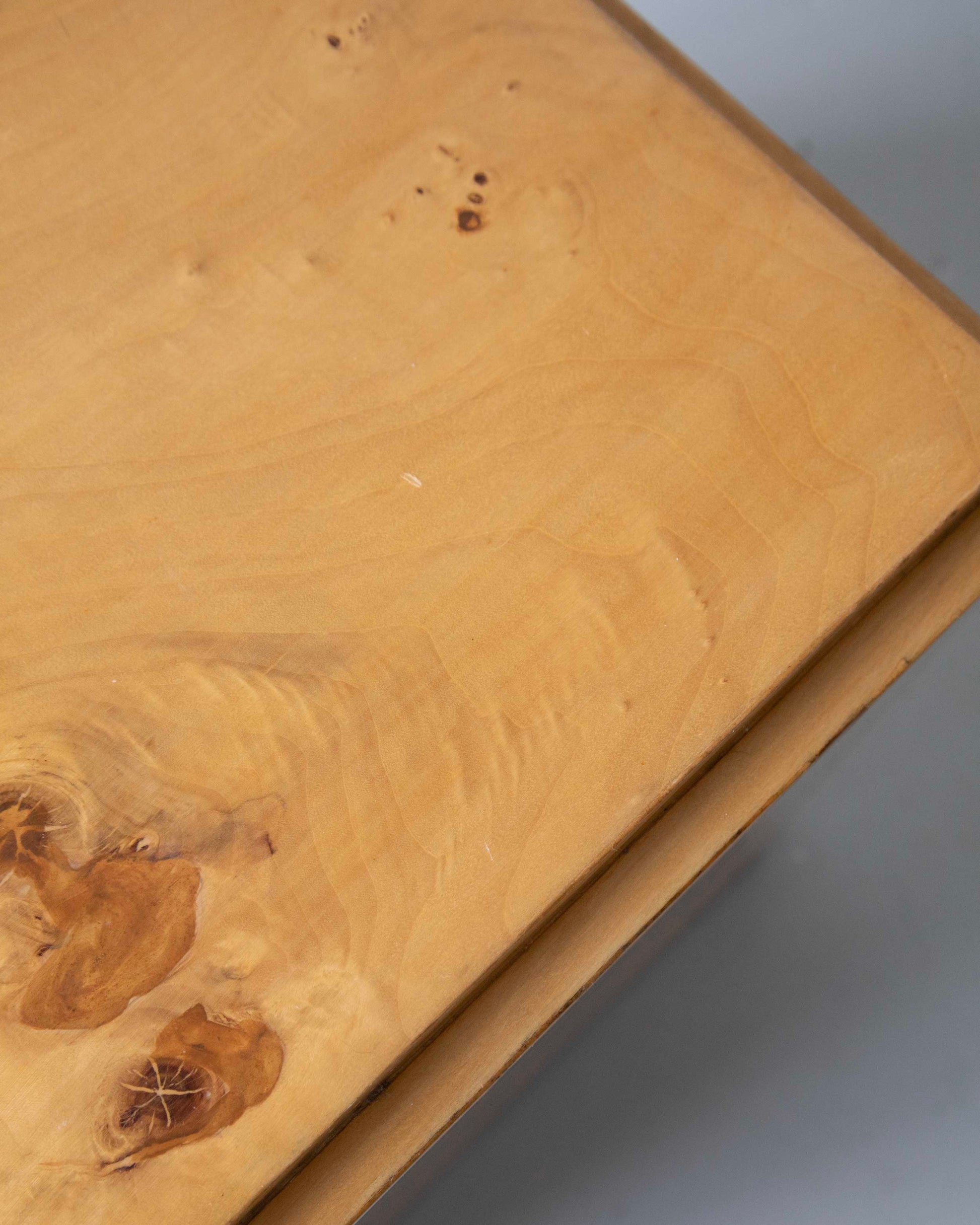Burl wood veneer table in the style of Milo Baughman. Works as a side table, coffee table or display.