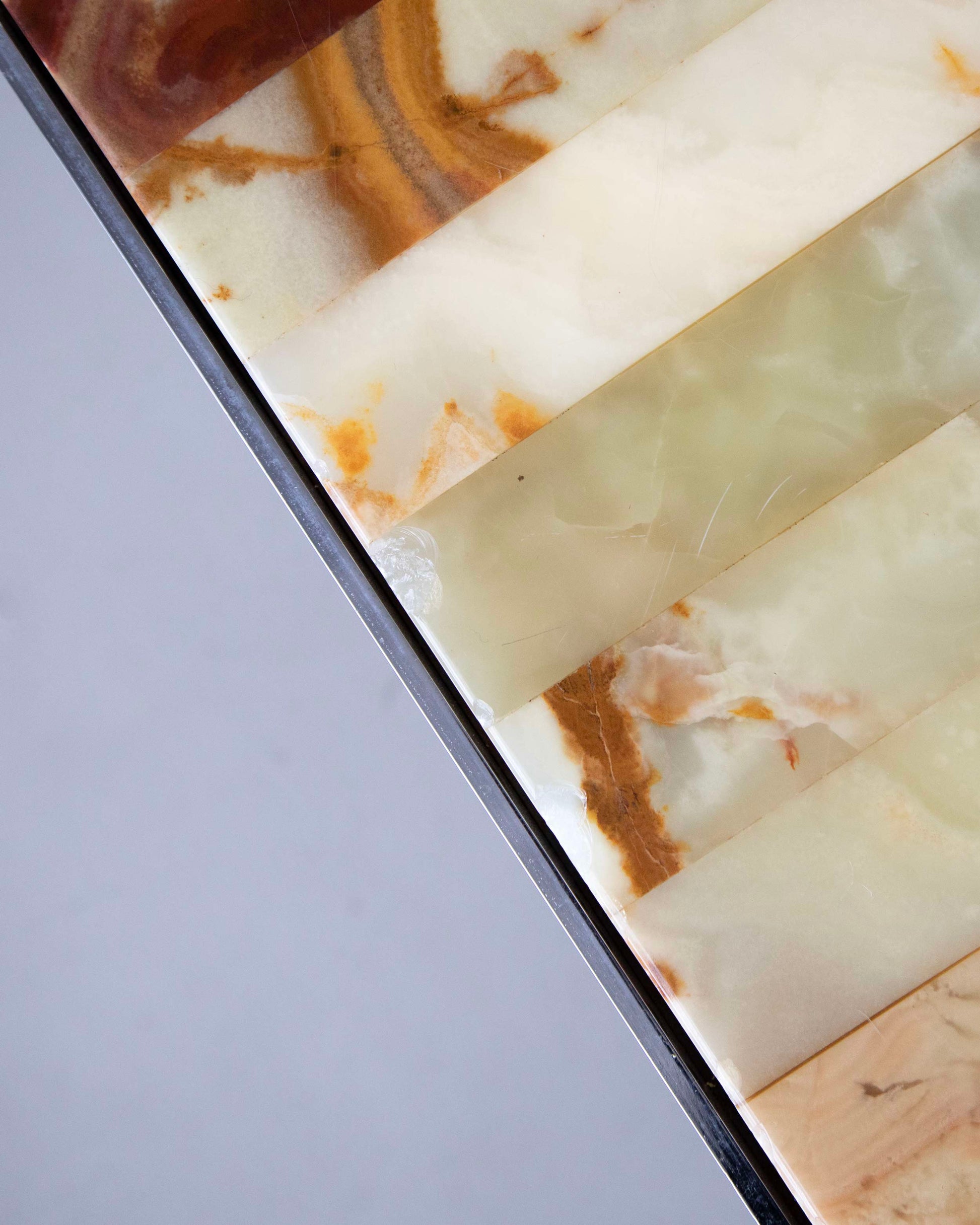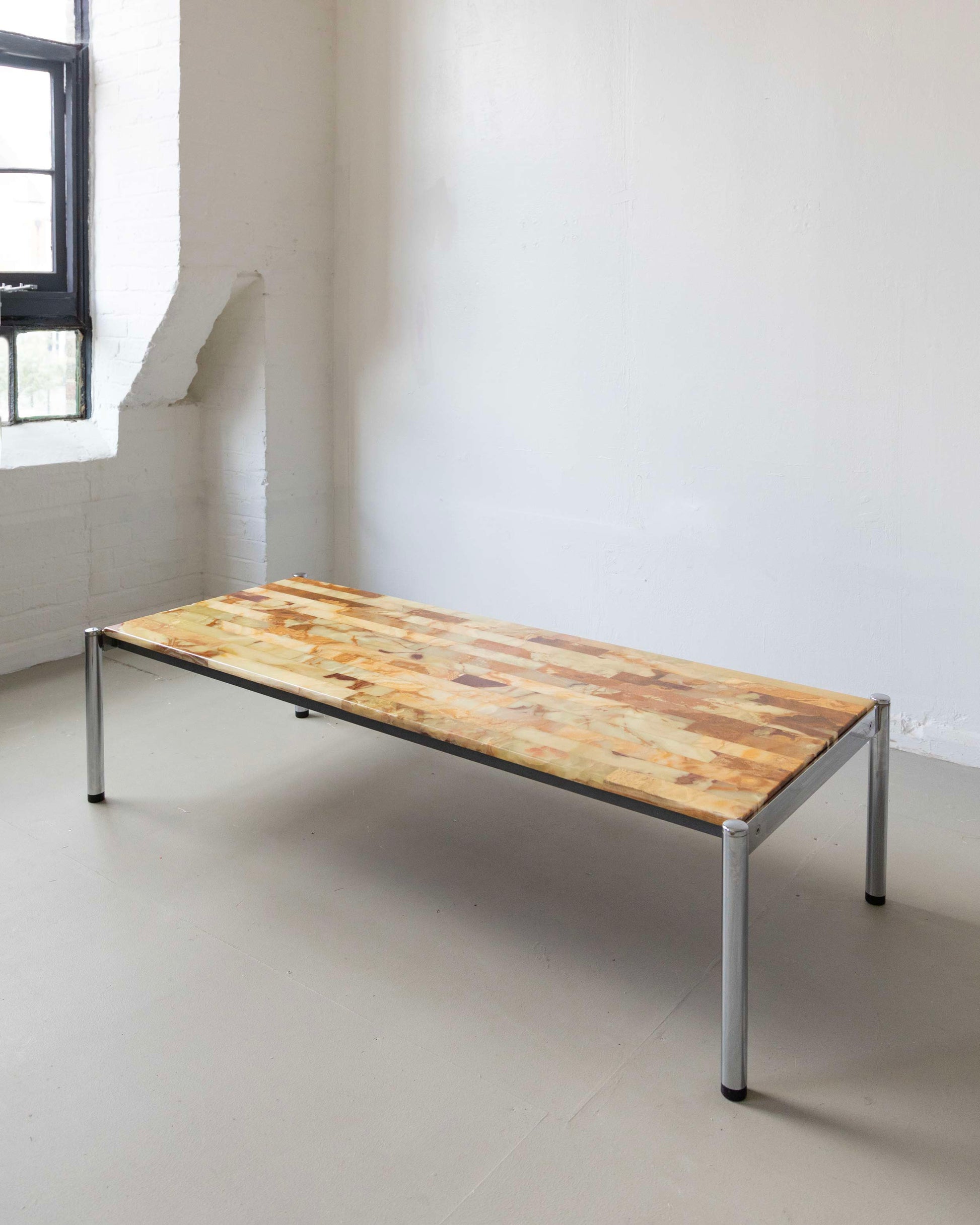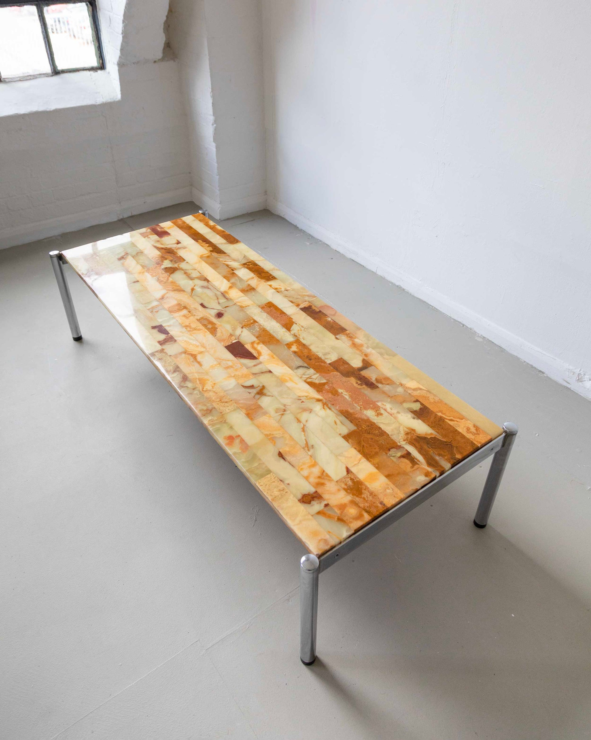 Vintage coffee table from the 1970s featuring chrome legs and mosaic marble top. The designer is unknown but showcases typical European 1970s design.