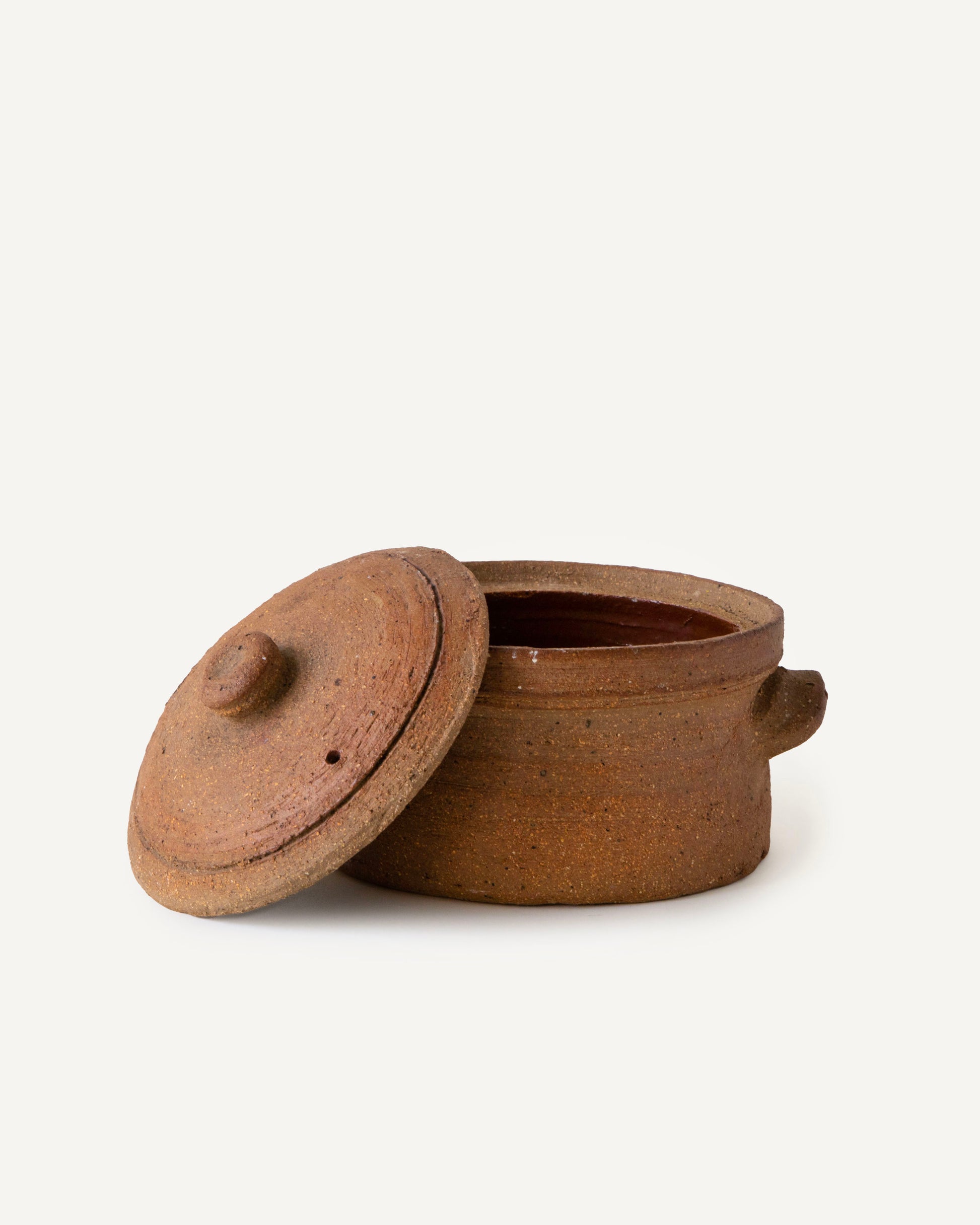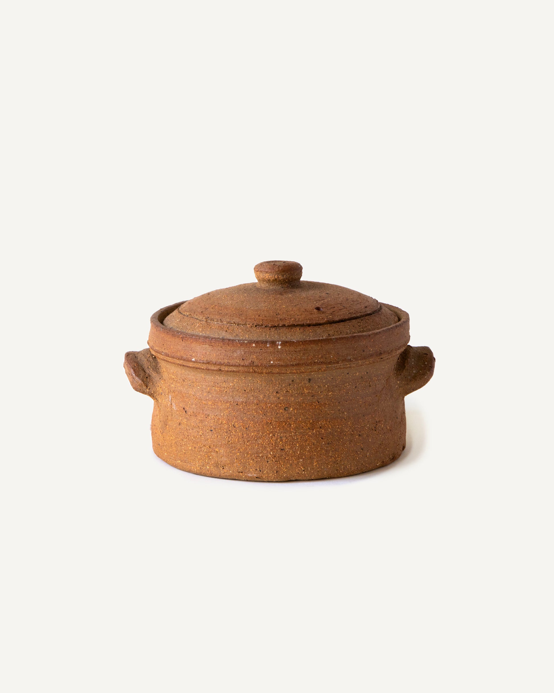 Lidded ceramic pot with handles and distinct 'toasted' texture. A beautiful storage option for the bathroom, kitchen, or vanity.